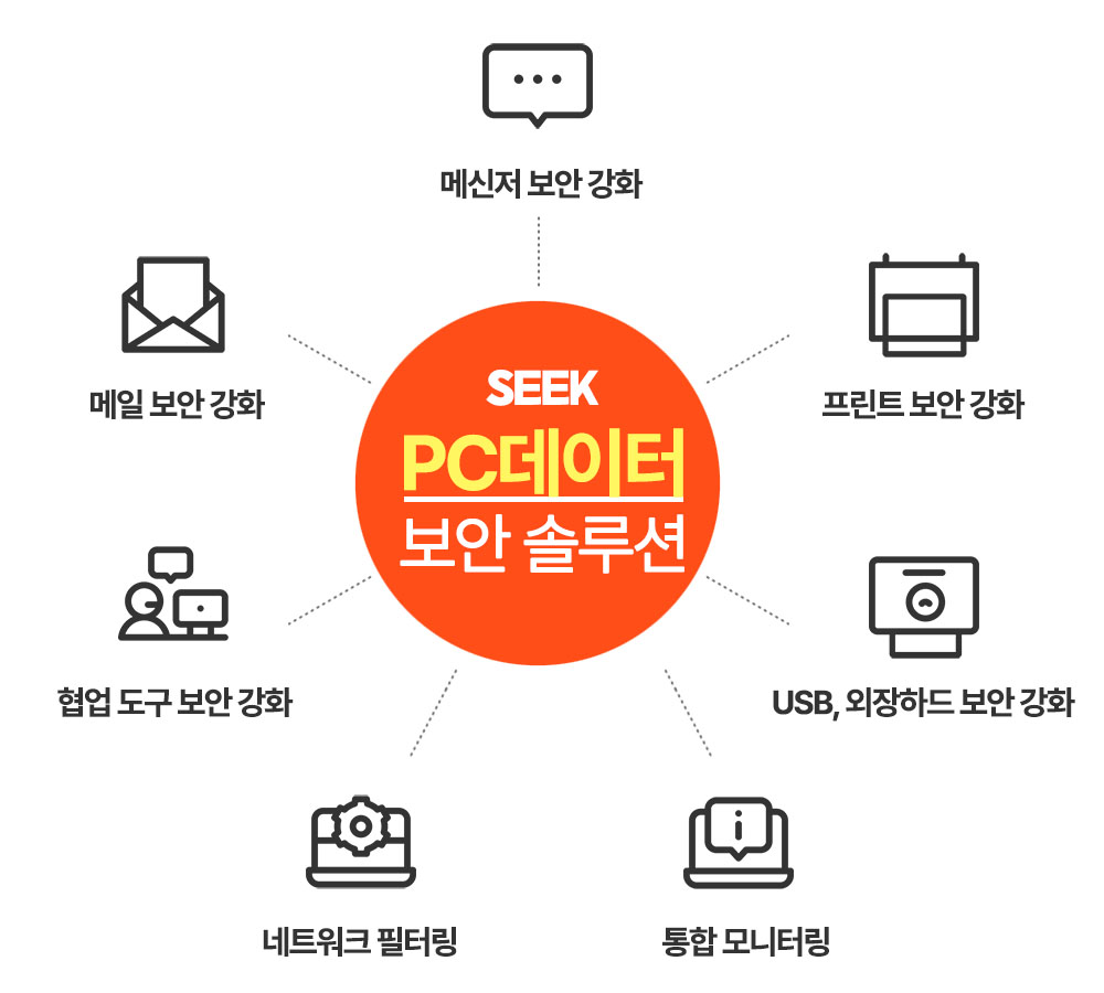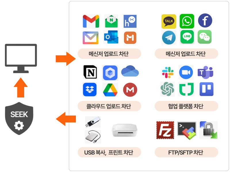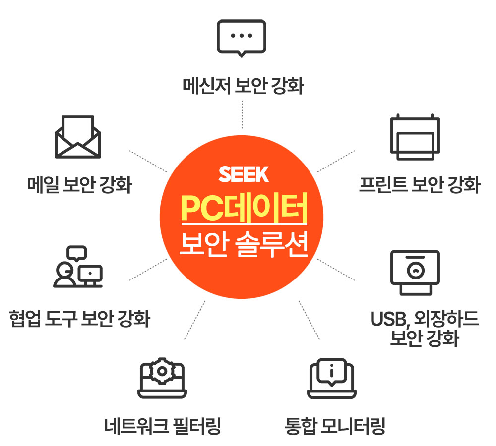 SEEK는 AI·양자 기반 차세대 데이터 유출 방지(DLP) 솔루션으로, PC 단말과 서버 간에 다계층 보안 기능을 제공하여 사용자의 고의·과실 및 해킹에 의한 정보 유출을 효과적으로 차단합니다.