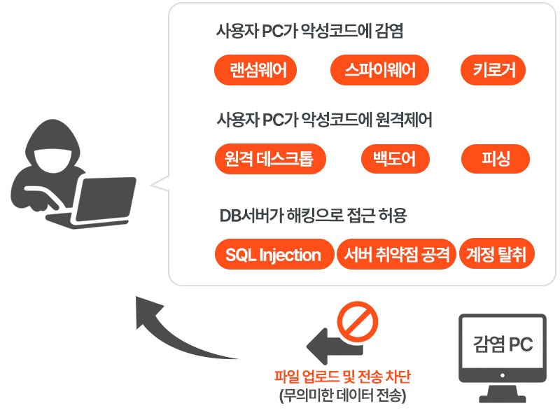 악성코드 감염이나 원격제어로 해커가 PC에 침투해도 SEEK가 파일 외부 전송 단계에서 차단